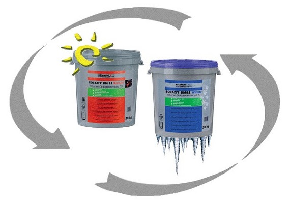 BOTAZIT® BM 92 występuje w dwóch odmianach asortymentowych. BOTAZIT® BM 92 Schnell to wzmocniona specjalnymi włóknami dwukomponentowa bitumiczna masa uszczelniająca, charakteryzująca się szybkim schnięciem oraz szybką odpornością na działanie opadów atmosferycznych, po wyschnięciu tworzy szczelną elastyczną (mostkującą rysy) powłokę. Produkt może być nanoszony przy zastosowaniu urządzenia natryskowego. Tzw. wersja zimowa czyli BOTAZIT® BM 92 Winter, może być ponadto przechowywany w temperaturze do -5 °C, a jego obróbka możliwa jest już przy temperaturze podłoża oraz otoczenia powyżej 0 °C. BOTAZIT® BM 92 pozwala praktycznie przez cały rok wykonywać izolację budynków przeciw wilgotności gruntu, niespiętrzającej lub spiętrzającej się wodzie infiltracyjnej, a także wodzie gruntowej której poziom okresowo lub na stałe występuje powyżej poziomu posadowienia budynku.