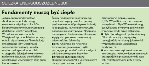 Skuteczna ochrona. Fundamenty powinny być zabezpieczone przed wyziębianiem oraz przed działaniem wilgoci, mokre szybko bowiem niszczeją wskutek zamarzania znajdującej się w nich wody. Zmniejsza się też przez to ich izolacyjność termiczna, a w związku z tym przez podłogę na gruncie czy strop nad piwnicą oraz przez ściany nadziemia szybciej ucieka ciepło. Zawilgocone fundamenty prowadzą do pojawienia się wilgoci w ścianach parteru, łuszczenia się farb, a w końcu w domu powstają grzyby i pleśń. Skuteczną ochronę cieplną zapewniają izolacje nowej generacji, takie jak płyty z polistyrenu ekstrudowanego. Za zabezpieczenie przeciwwilgociowe odpowiadają nowoczesne folie EPDM z kauczuku syntetycznego, membrany kauczukowo-bitumiczne, masy bitumiczne i mineralne, panele lub membrany zawierające bentonit. Również przy izolacji poziomej używa się nowoczesnych pap – na osnowie z włókna szklanego lub polipropylenu. Mają lepsze właściwości, są odporne na uszkodzenia mechaniczne, niską i wysoką temperaturę oraz inne warunki atmosferyczne.