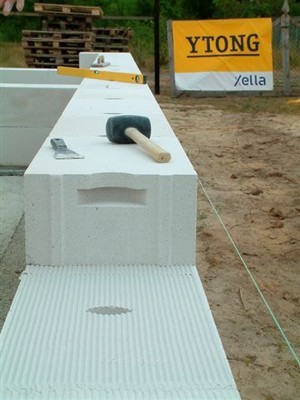 Murowanie każdej ściany należy rozpocząć od ułożenia izolacji przeciwwilgociowej na płycie lub fundamentach. W przypadku ścian z bloczków YTONG ENERGO o szerokości 48 cm, zalecana szerokość fundamentu wynosi co najmniej 32 cm.