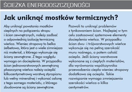 Strop to poziomy element konstrukcyjny, którego zadaniem jest usztywnienie konstrukcji domu, podział na kondygnacje, przenoszenie obciążeń oraz izolacja pomieszczeń na różnych kondygnacjach przed przenikaniem dźwięków i ciepła. Wybór odpowiedniego rodzaju stropu wpływa nie tylko na koszt, ale też czas jego wykonania. Prace budowlane Tradycyjne rozwiązania i nowoczesne propozycje Jak uniknąć mostków termicznych? ŚCIEŻKA ENERGOOSZCZĘDNOŚCI Aby uniknąć powstania mostków cieplnych na połączeniu stropu i ścian zewnętrznych, należy zadbać o odpowiednią izolację termiczną wieńca. Wieniec stropowy to belka żelbetowa, która jest o wiele zimniejsza niż materiał, z którego wykonuje się ściany zewnętrzne. Z tego względu wymaga on docieplenia. W przypadku ścian jednowarstwowych zewnętrzną płaszczyznę wieńca należy ocieplić kilkucentymetrową warstwą styropianu lub wełny mineralnej i wykonać osłonę z tego samego materiału, z którego zbudowane są ściany zewnętrzne. Pozwoli to uniknąć problemów z tynkowaniem ścian. Najlepiej w tym celu zastosować systemowe elementy docieplenia wieńca. W przypadku ścian dwu- i trójwarstwowych wieńce wykonuje się na pełną szerokość muru nośnego, a potem całość ociepla. Jeśli ściany warstwowe wykonane są z ciepłych materiałów, dla wyrównania współczynnika przewodzenia ciepła wieniec stropowy dodatkowo się ociepla. Takie rozwiązanie wymaga zmniejszenia szerokości wieńca o kilka centymetrów. przyspiesza zastosowanie elementów prefabrykowanych, które są przywożone na budowę i tu montowane. Stropy przygotowywane w całości na budowie również cieszą się dużą popularnością.