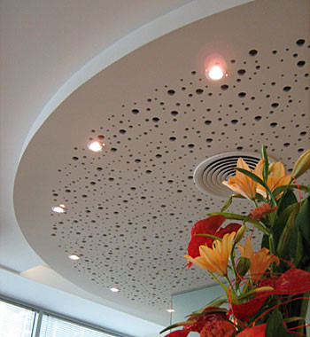 Płyty perforowane NIDA Sonic, to szeroka gama płyt gipsowo-kartonowych o różnych rodzajach otworowania oraz stopniu perforacji. Są one montowane, jako poszycie sufitów podwieszanych, zwiększając pochłanianie dźwięku w pomieszczeniu. Charakterystyka pochłaniania dźwięku płyt NIDA Sonic pokrywa się z widmem natężenia ludzkiego głosu, w funkcji częstotliwości. Oznacza to, że płyty te idealnie tłumią hałas pochodzący od ludzkiego głosu, jednocześnie redukując zjawisko pogłosu, czyli odbicia dźwięku.