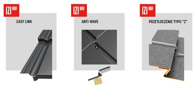 Przetłoczenie wzdłużne oraz atrakcyjne przetłoczenie typu „Z” zabezpieczają przed efektem falowania, w czym pomaga także system ANTI-WAVE, który dodatkowo minimalizuje naprężenia. EASY LINK jest z kolei autorskim rozwiązaniem, dzięki któremu arkusze pasują do siebie jak nigdy wcześniej. Do tego wszystkiego dedykowany, funkcjonalny i kompletny system akcesoriów.