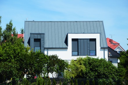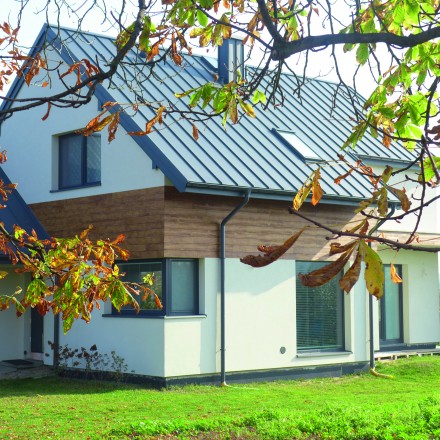 Po blachę do wykończenia ścian zewnętrznych warto sięgnąć, jeśli tym materiałem pokrywamy remontowany dach o zwartej kubicznej formie. Ułożone w pionie na ścianach pasy blachy mogą optycznie podwyższać dom, natomiast jeśli zostały zaaranżowane w formie poziomych elementów, będą podkreślać horyzontalny układ elewacji. Szczególne zalety praktyczne, a także estetyczne ma elewacja z blachy na rąbek stojący. Doskonały efekt nowoczesnej fasady domu da wykorzystanie odpowiednio wyprofilowanych paneli. Dominują te w odcieniach szarości – poczynając od jasnych srebrzystoszarych po ciemne grafitowe. Najczęściej wykorzystuje się materiały szerokości od 30 do 50 cm i długości od 2 do 4 m. Ważnym wymiarem jest grubość blachy – nie powinna być mniejsza niż 0,8 mm, co gwarantuje, że nie będzie się wyginać. Wpływ na trwałość okładziny ściennej z blachy ma także wysokość rąbka stojącego. Przyjmuje się, że 25 mm zapewnia szczelną ochronę przed wodą. Najtrwalsze są elementy wykonane z blachy cynkowo-tytanowej. Sięga się także po panele z blachy stalowej z powłoką ochronną.