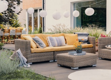 Lampy przeznaczone do montowania na zewnątrz domu, określane także jako outdoor, to dzisiaj bardzo różnorodna grupa produktów. Do chętnie stosowanych na tarasach czy balkonach należą oprawy naścienne, czyli kinkiety. Dają one delikatne, nieco rozproszone światło, idealne do podkreślenia urody elewacji budynku i dodania strefie wypoczynku głębi. Dużą grupę tworzą również lampy sufitowe. Stosuje się je do ogólnego oświetlenia zewnętrznej przestrzeni wypoczynkowej. Funkcję tę spełnią najlepiej plafoniery czy różnego rodzaju spoty. Te typy lamp sprawdzają się też w roli kierunkowego światła miejscowego, przydatnego, gdy chcemy wyciągnąć z mroku np. stół. Bardzo popularne są lampy stojące. Mogą być umocowane w podłożu lub na nim ustawiane. Na stosunkowo niewielkiej powierzchni, jaką tworzą przydomowe strefy pośrednie, najbardziej funkcjonalne są niskie modele o wysokości ok. 45-50 cm. Światło, które dają, jest dyskretne i nie będzie rażące dla osób przebywających w jego zasięgu. Jednocześnie operuje na niewielkich wysokościach tarasu czy balkonu, co podnosi nasze poczucie bezpieczeństwa, a także podkreśli urodę roślin posadzonych w ich pobliżu. Podobną funkcję spełni oświetlenie podłogowe. To płaskie lampy LED-owe zlicowane z posadzką lub montowane w dolnych partiach ścian. Wykorzystuje się je, by wyznaczyć granice tarasu lub zaznaczyć stopnie schodów tarasowych. Wielkim powodzeniem cieszą się lampy dekoracyjne, mogą wzmacniać urok zieleni lub budować klimat, to m.in. coraz popularniejsze girlandy czy cotton balls, a także lampki określane jako świąteczne. Szczególny efekt da zastosowanie taśm LED, które można umieścić w podbitce dachowej czy posadzce tarasowej – nie tylko oświetlają, ale zdobią i podkreślają detale architektoniczne.