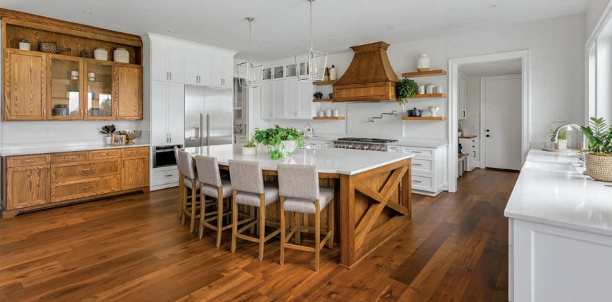 Otwarta strefa dzienna weszła do standardu projektowania wnętrz – cenimy ją za oddech, funkcjonalność oraz otwieranie wielu możliwości aranżacyjnych. Urodę dużych pomieszczeń idealnie podkreślają szerokie deski podłogowe. Za takie są uznawane produkty, które mają ponad 20 cm szerokości. Jeśli zdecydujemy się na wybór paneli laminowanych, taki warunek spełnią modele o szerokości 24,4 cm i długości 138 cm. Relacja podłoga- -przestrzeń jest dwustronna – takie deski podkreślą ponadstandardowy charakter wnętrza, a ta z kolei uwypukli ponadprzeciętne wymiary, a także kolorystykę i strukturę okładziny podłogowej. Jednocześnie ciepło, jakie daje drewniany materiał oraz jego bogata struktura i oryginalna kolorystyka uczynią duże wnętrze przytulnym.