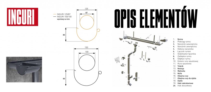 Systemy INGURI® 125/87 i 150/100 są kompletnymi systemami rynnowymi produkowanymi z najwyższej jakości stali powlekanej organicznie lub powłokami metalicznymi ALUZINC. Wszystkie elementy systemów zostały zaprojektowane w sposób zapewniający poprawne spasowanie i łatwość oraz szybkość montażu systemu. Kształt i głębokość rynien zapewniają skuteczne odprowadzenie wody nawet podczas intensywnych i długotrwałych opadów.