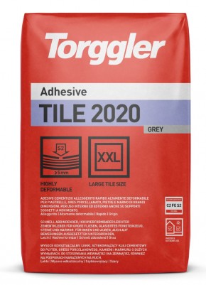 TILE 2020 to klej cementowy w proszku, dostępny w kolorze białym i szarym, na bazie specjalnych wysokowytrzymałych, szybkowiążących i utwardzających się cementów, wyselekcjonowanych kruszyw i o podwyższonej zawartości syntetycznych żywic oraz specjalnych dodatków. Formuła została opracowana specjalnie do układania wielkoformatowych płytek z gresu porcelanowego i szkliwionego oraz płytek ceramicznych wszelkich typów i formatów a także wszelkich typów i formatów płytek z kamienia naturalnego (o ile są niewrażliwe na wykwity, przebarwienia i deformacje), a także do stosowania na podłożach podlegających odkształceniom.