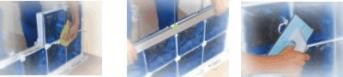 Podczas montażu na bieżąco usuwamy nadmiar zaprawy mokrą szmatką nie dopuszczając do jej wyschnięcia aby nie porysować szkła. Po ułożeniu wszystkich pustaków, gdy zaprawa już zwiąże odrywamy płytki po obu stronach krzyżyków dystansowych, wygładzamy szczeliny i wykańczamy konstrukcję. Biała zaprawa CLAROGLASS zastępuje fugę, ale możemy ściankę wykończyć fugami kolorowymi, odpowiednimi do spoin o szerokości 1cm. W tym celu podczas montażu zostawiamy na ok. 1 cm głębokości miejsce bez zaprawy, i szczeliny te wypełniamy potem fugą. W celu zabezpieczenia konstrukcji przed wnikaniem wilgoci, należy miejsca styku ramy obwodowej z murem uszczelnić elastycznym materiałem np. silikonem. Jeżeli wymiary ścianek przekraczają 3x4m (ścianki wewnętrzne, gdzie 4m jest wymiarem poziomym) lub 3x3m (ścianki zewnętrzne) należy wprowadzić żebra rozdzielcze z dylatacją.