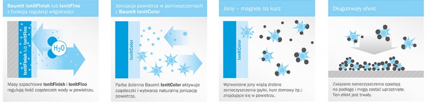 Jak to możliwe? Otóż powietrze posiada swoją naturalną wilgotność – zawiera dużą ilość cząsteczek wody. Przy kontakcie z pomalowaną powierzchnią (dzięki specjalnym składnikom zawartym w farbie Baumit IonitColor) ulegają one naładowaniu i przyjmują postać jonów, a im jest ich więcej, tym większa ilość zanieczyszczeń ulega związaniu i opada na podłogę, by można było je usunąć podczas sprzątania. Powietrze w pomieszczeniu staje się świeższe i czystsze, co z kolei przekłada się na łatwiejsze oddychanie, lepszą odporność naszego organizmu oraz mniejsze ryzyko reakcji alergicznych czy infekcji wirusowych.