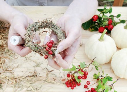 6. Wybieramy fragment, który będziemy dekorować ozdobnymi, jesiennymi owocami (najlepiej maskując miejsce łączenia) i wplatamy weń poszczególne gałązki, oplatając oraz podwiązując je nicią.
