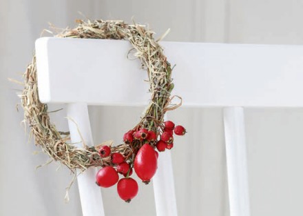 1. Do przygotowania tej minimalistycznej, ale jakże sielskiej dekoracji potrzebne będą: nić pasmanteryjna lub florystyczna w kolorze jak najbardziej zbliżonym do przygotowanej przez nas wiązki suchej trawy (może być szara, écru, beżowa lub seledynowa); gałązki jesiennych owoców: dzika róża, kalina, głóg, jarzębina, dziurawiec, miechunka itp.; niewielkie ozdobne dynie lub tykwy w dowolnie wybranym kolorze; nieduży snopek suchej trawy o wytrzymałej niełamiącej się strukturze, np. suszona trawa morska.