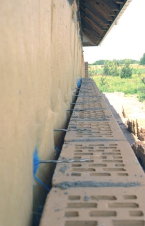 Przy otworach okiennych i drzwiowych, przy narożu budynku należy dodatkowo umieścić po 3 kotwy na 1 m; linia kotew - 15 cm od otworów