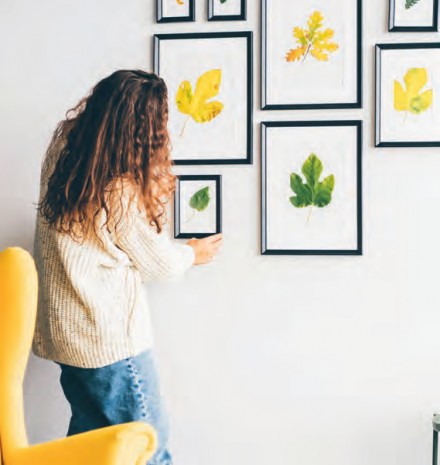 Niebanalny kształt i gra przechodzących gradientem barw liścia nierzadko budzi w nas podziw nad tym, co potrafi stworzyć natura. Jesienny liść to wdzięczny obiekt do ujęcia w ramy. Warto zaprezentować go w formie ściennego lub stojącego obrazka. Aby liść zachował jak najlepsze walory dekoracyjne, powinien już na wstępie, czyli podczas zbierania, być czysty i suchy. Następnie trzeba jak najszybciej odprowadzić z niego wilgoć – osuszyć na pergaminie pomiędzy stronami ciężkiej książki lub w dedykowanej na ten cel prasie do suszenia (obowiązkowo na wyposażeniu amatorów zielników). Liście podczas wysychania tracą intensywny, wyrazisty kolor, nieco ciemnieją i matowieją, stają się też kruche. Jeśli po procesie suszenia liść do dekoracji nie okaże się efektowny, możemy pomalować go farbą akrylową, flamastrem olejowym lub lakierem barwnym, który dodatkowo usztywni liść. Wkładając w ramkę, nie zapomnijmy o ładnym tle i dodatkowo podnoszącym rangę dekoracji passe-partout.